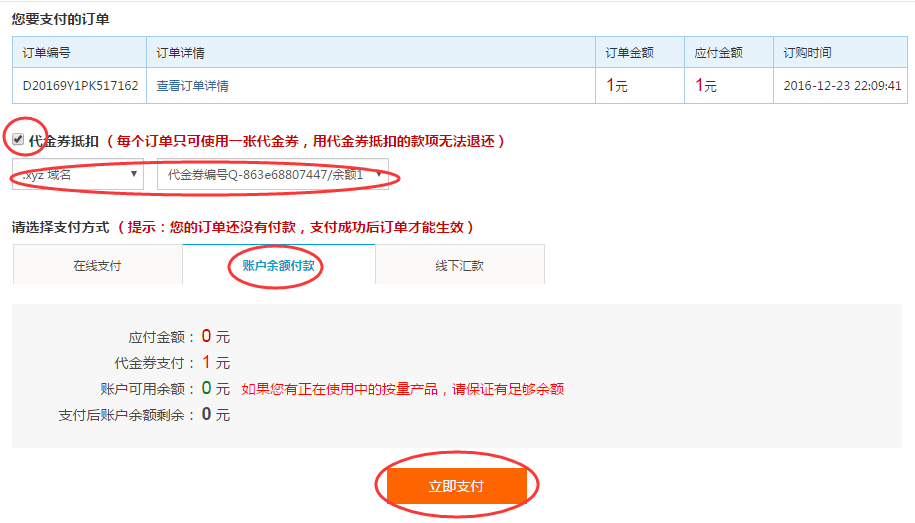 7、选择使用代金券来抵扣。然后选择“账号余额付款”来完成结算。