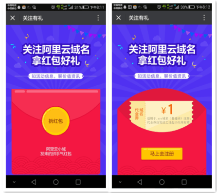 - 参与方式:关注阿里云域名微信公众即可领取,以前关注的用户和新关注的用户都可以参与
