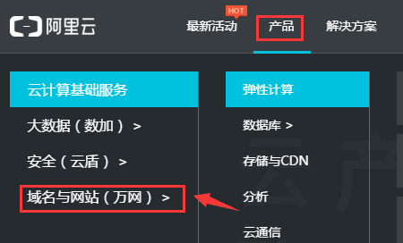 4、也可使用电脑打开阿里云官网,如果你没有阿里云账号就先注册一个账号并登陆,然后点击导航栏“产品”,选择“域名与网站(万网)”。