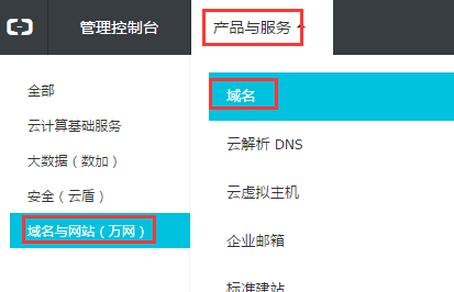 1、 2、域名购买好后,点击“控制台”进入到阿里云管理面板,然后点击左侧产品服务栏的“域名”。