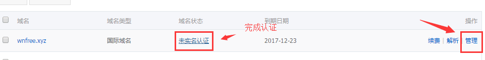 3、域名没有完成实名认证的可以先点击完成实名认证,然后点击“管理”进入到域名管理控制面板。