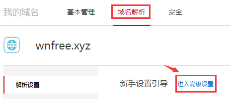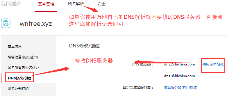 5、如果你选择使用万网域名控制面板自带的解析功能,就不需要更改DNS服务器地址。直接点击“域名解析”进入到解析管理页面。