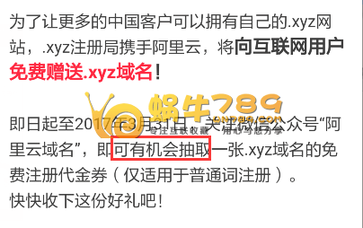 以下内容是2016年12月24日介绍的,本次活动参与流程和上次完全一致,连活动地址也一致。所以就不再另外发布新文章。 阿里云.xyz免费顶级域名领取方式非常简单,使用微信关注公众号即可领取代金券,人人都可领取,无任何门槛。其实阿里云.xyz注册一直有促销活动,目前首年只需一元,但是.xyz域名续费有点贵,需要69元/年。另外目前.xyz域名已经获得了工信部稳定执照,在国内已经可以申请稳定了。关于免费领.xyz活动的截止时间,蜗牛不是很清楚,如果你需要领的话,尽快去领,以免活动结束。本站其他免费域名教程: 【阿里云免费.xin域名】新用户完成实名认证领取.xin域名一年使用权 【景安网络Gainet】2016年新注册用户赠送免费top顶级域名
