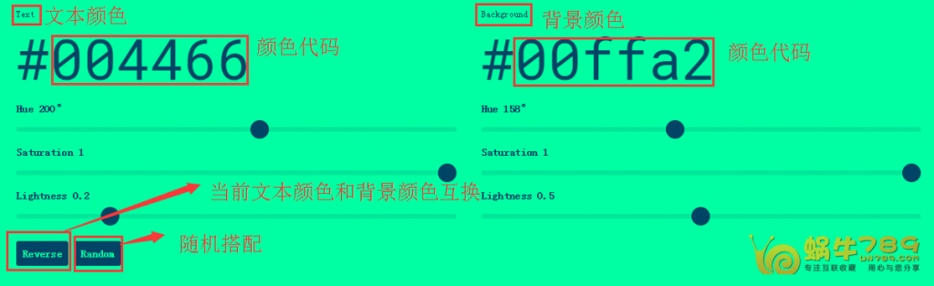 1、点击进入Colorable在线色彩搭配页面,点击“Random”随机搭配颜色,如果你要让当前文本和背景颜色互换就点击“Reverse”。