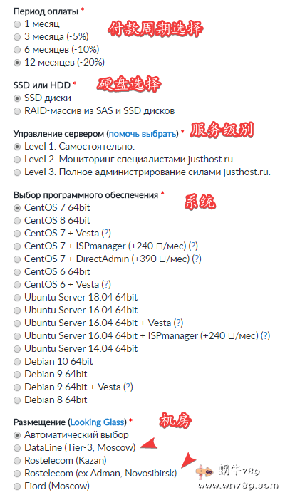 下面整理的是HDD及SSD硬盘的两款最低配置方案,个人建议选择SSD固态硬盘方案更好一点,因为价格方面相差确实不大,蜗牛体验过HDD方案硬盘读写速度是限制在30 MB/s,如果能接受这个读写速度的话可以考虑节约一点是一点。 至于选择机房,建议选择DataLine (Tier-3, Moscow)或者Rostelecom (ex Adman, Novosibirsk)