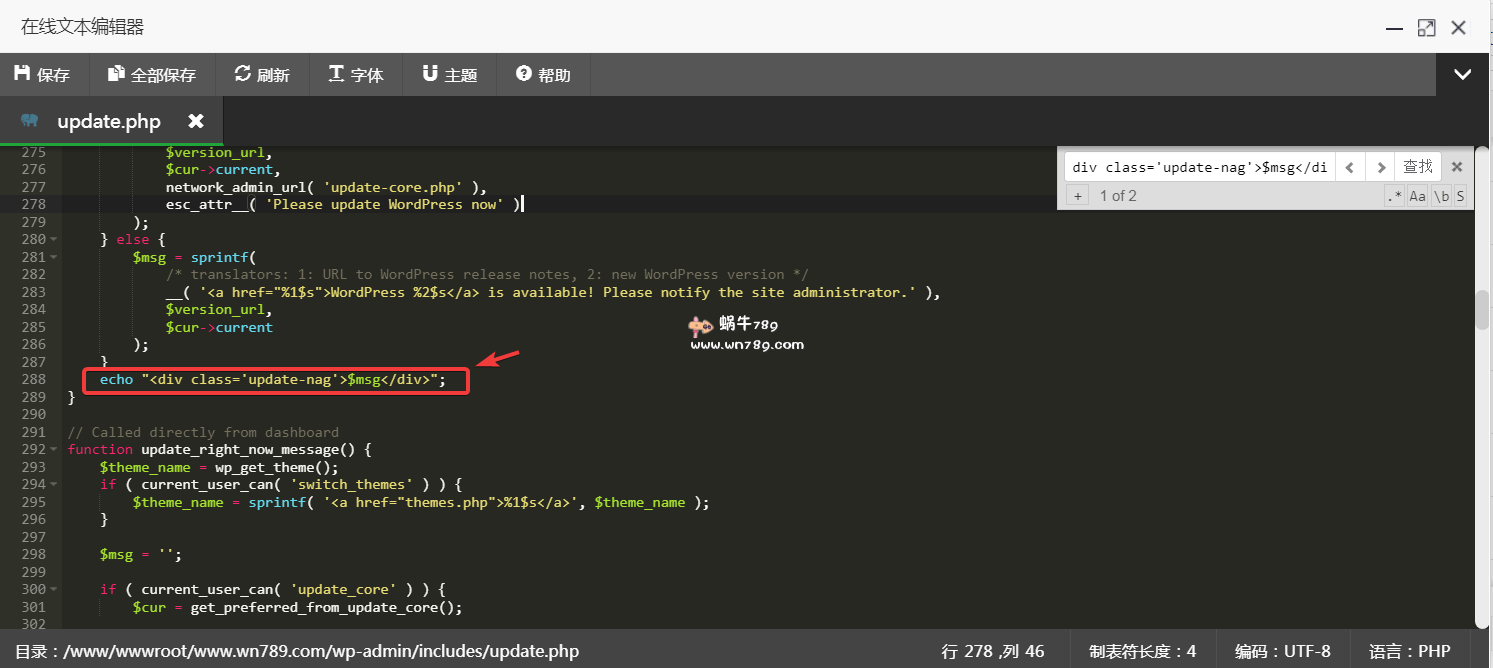 然后在“update.php”文件当中删除掉下面代码。就可以取消掉“自动升级WordPress失败 —— 请再试一次。”提示了。取消后是不是感觉清爽多了。echo "<div class='update-nag'>$msg</div>";