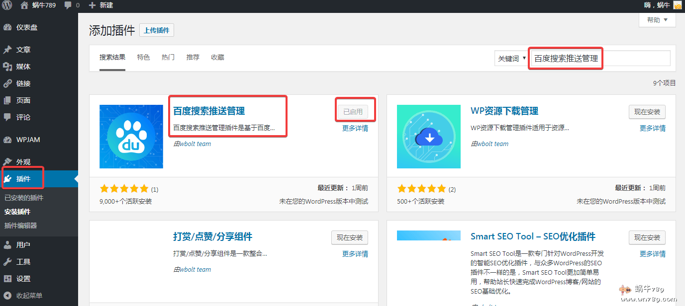1、进入自己WordPress后台,点击左侧“插件”按钮→点击左上角“安装插件”→在右侧“关键词”搜索“百度搜索推送管理”即可查询到插件,点击安装,安装完成后启用即可。