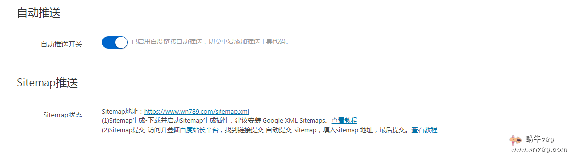 建议大家也开启“自动推送”功能。另外如果还没有在百度搜索资源平台添加Sitemap地图推送的,可以查看他们的教程添加一个。