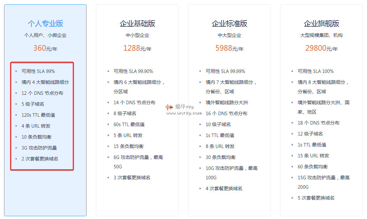 1、首先我们看看DNSPod DNS智能解析个人专业版有哪些服务:可用性SLA保证99%、境内4大智能线路细分、12个DNS 节点分布、5级子域名、120s TTL 最低值、4 条 URL 专线、10 条负载均衡、3G 攻击防护流量、2 次套餐更换域名。