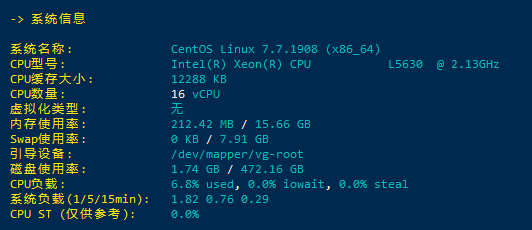 ---------------------------------------------------------------------- CPU model : Intel(R) Xeon(R) CPU L5630 @ 2.13GHz Number of cores : 16 CPU frequency : 2133.489 MHz Total size of Disk : 451.2 GB (1.8 GB Used) Total amount of Mem : 16035 MB (171 MB Used) Total amount of Swap : 8095 MB (0 MB Used) System uptime : 0 days, 6 hour 14 min Load average : 2.06, 2.18, 2.13 OS : CentOS 7.7.1908 Arch : x86_64 (64 Bit) Kernel : 4.11.8-1.el7.elrepo.x86_64 ---------------------------------------------------------------------- I/O speed(1st run) : 217 MB/s I/O speed(2nd run) : 211 MB/s I/O speed(3rd run) : 211 MB/s Average I/O speed : 213.0 MB/s ---------------------------------------------------------------------- Node Name IPv4 address Download Speed CacheFly 205.234.175.175 11.3MB/s Linode, Tokyo2, JP 139.162.65.37 10.6MB/s Linode, Singapore, SG 139.162.23.4 9.92MB/s Linode, London, UK 176.58.107.39 10.3MB/s Linode, Frankfurt, DE 139.162.130.8 10.0MB/s Linode, Fremont, CA 50.116.14.9 11.3MB/s Softlayer, Dallas, TX 173.192.68.18 4.29MB/s Softlayer, Seattle, WA 67.228.112.250 11.1MB/s Softlayer, Frankfurt, DE 159.122.69.4 4.22MB/s Softlayer, Singapore, SG 119.81.28.170 9.46MB/s Softlayer, HongKong, CN 119.81.130.170 9.72MB/s ----------------------------------------------------------------------6、速度测完了,我们看看国内电信、联通、移动访问的路由追踪情况。 电信去是全程CN2,即CN2 GIA。