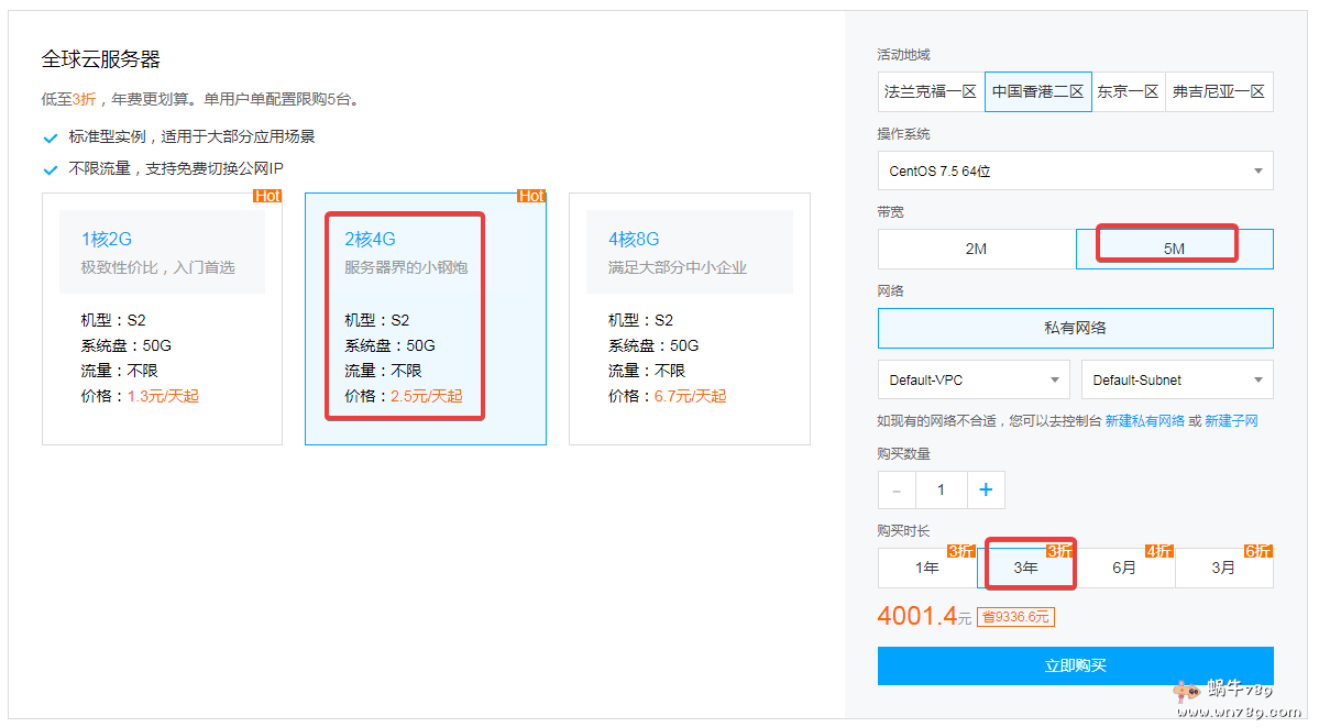 新老用户均可以选购的方案有下面两个类别,每个配置每个用户可以最多买五台,不怕你业务多、哈哈!另外稳定建站建议大家首先机房为香港,关于腾讯云香港云服务器的测评大家可以参考:腾讯云香港CN2 GIA云服务器测评。腾讯云服务器建站环境安装推荐大家使用宝塔Linux面板:#建站面板推荐#简单好用易上手的Linux建站面板/宝塔Linux面板专业版/首月0.99元体验/年付382元/三年716元/终身授权1388元。 首先我们来看看三折的方案。蜗牛截取的是2核4G配置、香港云服务器产品,最适合大众面稳定建站的配置及数据中心,推荐选择带宽是5Mbps,三年三折后4000元。当然也可以选择更高配置的4核8G内存方案、最高可以搭配10Mbps带宽。