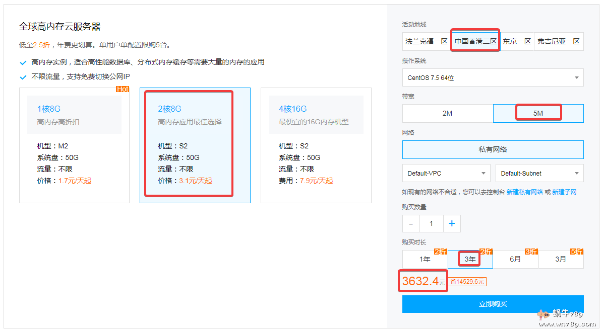 下面是高内存方案、最低是2折起,哈哈,其实性价比要高于上面三折产品。个人更推荐大家选择2核8G内存、5Mbps带宽方案,三年两折后只需3632元。