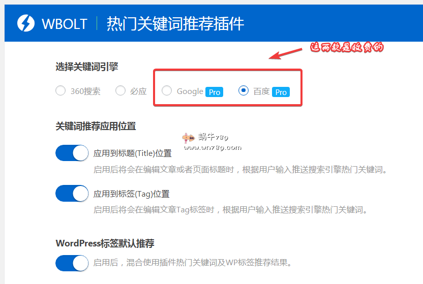 安装插件后的设置页面如下,免费版可以自动获取360搜索、必应搜索的热门关键词语,如果需要使用谷歌、百度两个搜索引擎的关键词语需要购买插件的授权码,费用是一次性49元。
