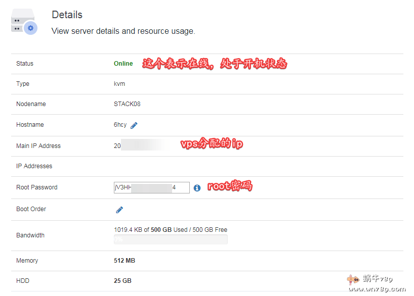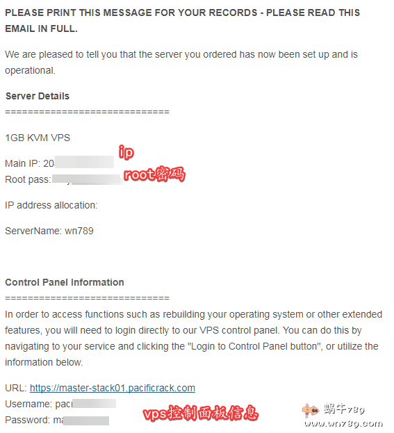 同时我们的邮箱也会受到如下邮件,里面包含了vps的ipv4、root密码以及vps控制面板登陆信息。