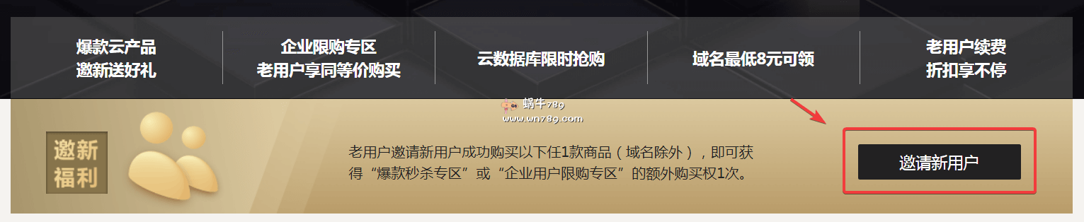 - 1、新用户可以直接购买“爆款秒杀专区”,新用户购买成功后可以通专属邀请链接邀请1名新用户购买域名除外的活动产品还可以额外得1次购买“爆款秒杀专区”或“企业用户限购专区”的机会!