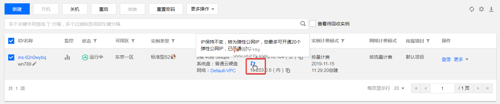 1、找到自己需要更换ip的腾讯云服务器,然后点击如下图按钮把ip转换为弹性公网ip。