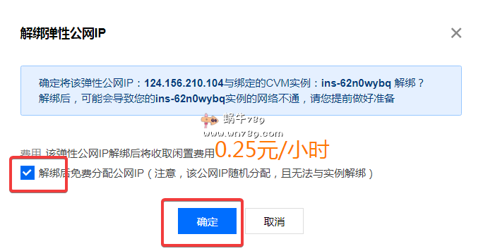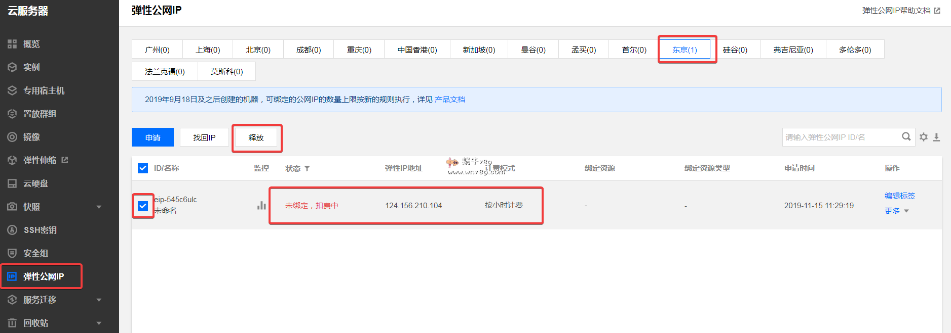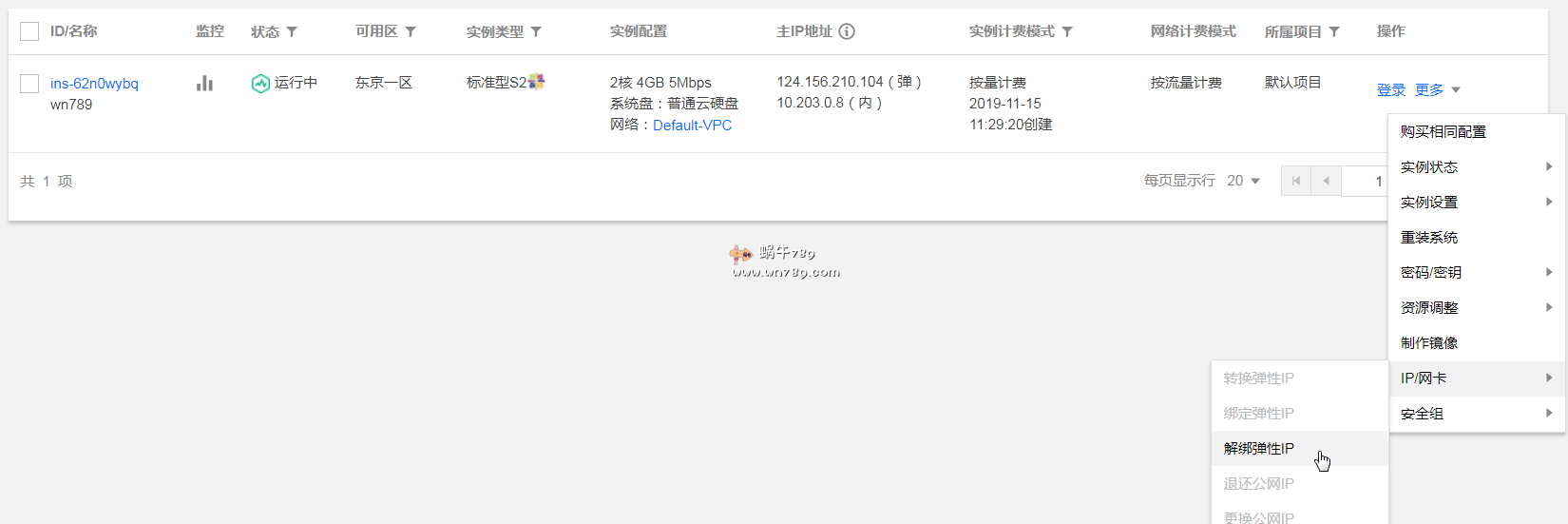 按下图操作即可完成ip解绑了,接班后会自动分配一个公网ip。