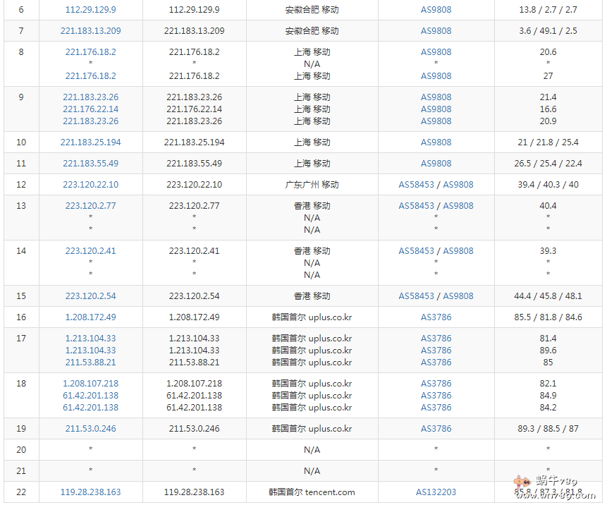 安徽合肥移动去程路由最终情况,走香港出、lg线路到韩国。