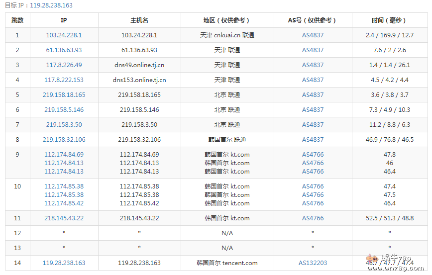 3、腾讯云韩国服务器到国内电信、联通、移动ping测试结果。114个有效测试节点,平均速度是76.9毫秒,电信、联通线路相对较好,移动平均速度稍差一点、但也再100毫秒左右,这个速度稳定建站是挺不错的。