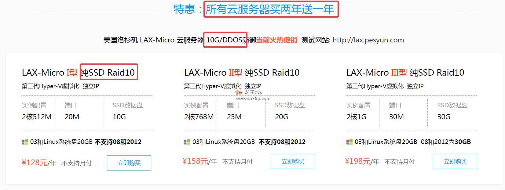 下面是此次限量的特价美国云服务器促销方案,亮点蜗牛都用红框标注了。买2年送1年,纯SSD硬盘,默认10Gbps DDoS防御。