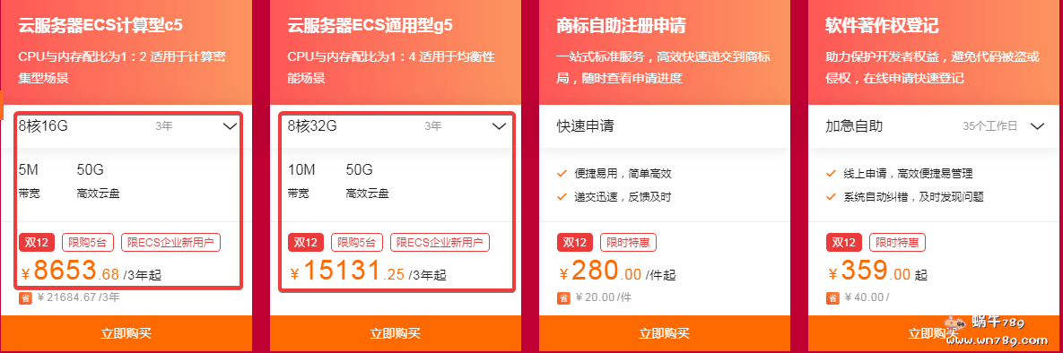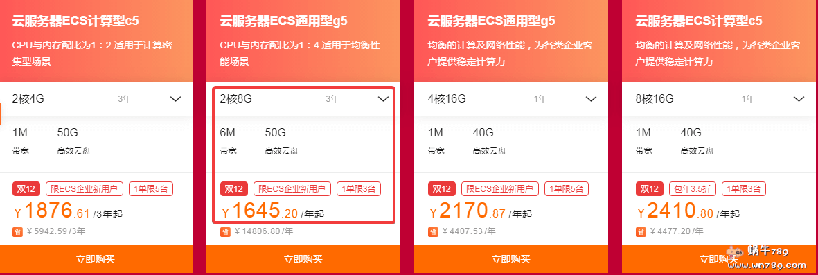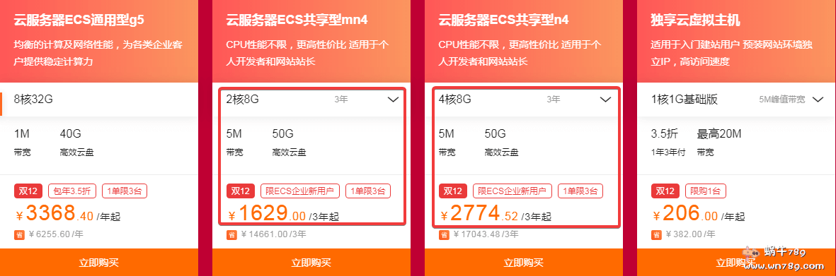 第二排重点关注4核8G内存5M带宽方案,如果觉得2核8G内存配置低了,4核8G内存5M带宽也只需2774元/3年!!