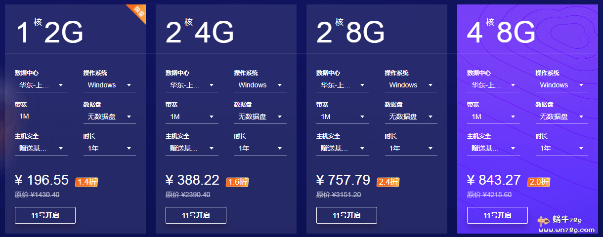 2核4G内存2M带宽配置398元/年、4核8G内存5M带宽配置998元/年,性价比是非常高的,蜗牛推荐大家选购此两款方案!!!
