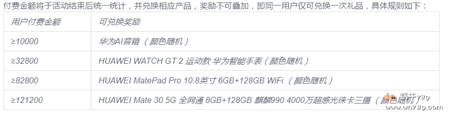 2019年12月11日-2019年12月31日活动期间,通过活动页面购买云服务(云市场除外)或使用12.12会员节活动优惠券在华为云官网新购云服务,累计新购实付付费金额达到一定额度,可兑换相应的实物礼品。付费金额指订单金额剔除折扣、优惠券等,即用户该笔订单实际付现金额,新购、按需转包周期订单金额可参与活动,续费升级订单金额不参与此活动,兑换实物奖励的订单不允许退订。礼品将于活动结束后(12月31日)20个工作日内寄出。
