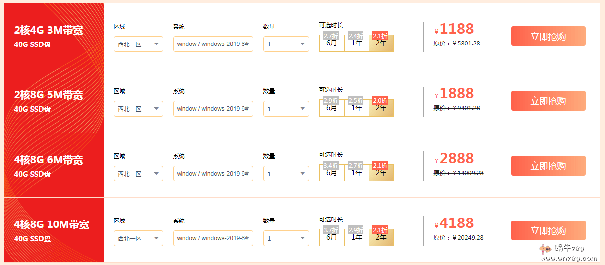 下面四款方案新老用户菊科参与,两年付折扣最大,基本是在2折优惠了。3M、5M、6M、10M带宽端口,每款方案最多可以一次购买三条。