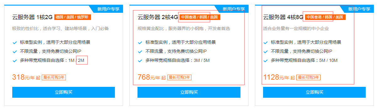 新用户专享一共是下图三款方案,腾讯云新用户一个身份证可以注册三个账号,每个账号均可以享受新用户的认定,实在想撸新用户促销云服务器方案自己身份也已经用完了还可以使用身边家人、同事、朋友身份注册。所有说门槛相对是比较低的。 如果有韩国云服务器的需求,那么就考虑在新用户专享活动当中撸吧。 带宽方面根据自己需求搭配2Mbps、3Mbps、5Mbps、10Mbps均为不限流量,想怎么跑就怎么跑。最高一次性可以购入三年,根本不需要担心续费价格高的问题,三年时间已经足够长了。