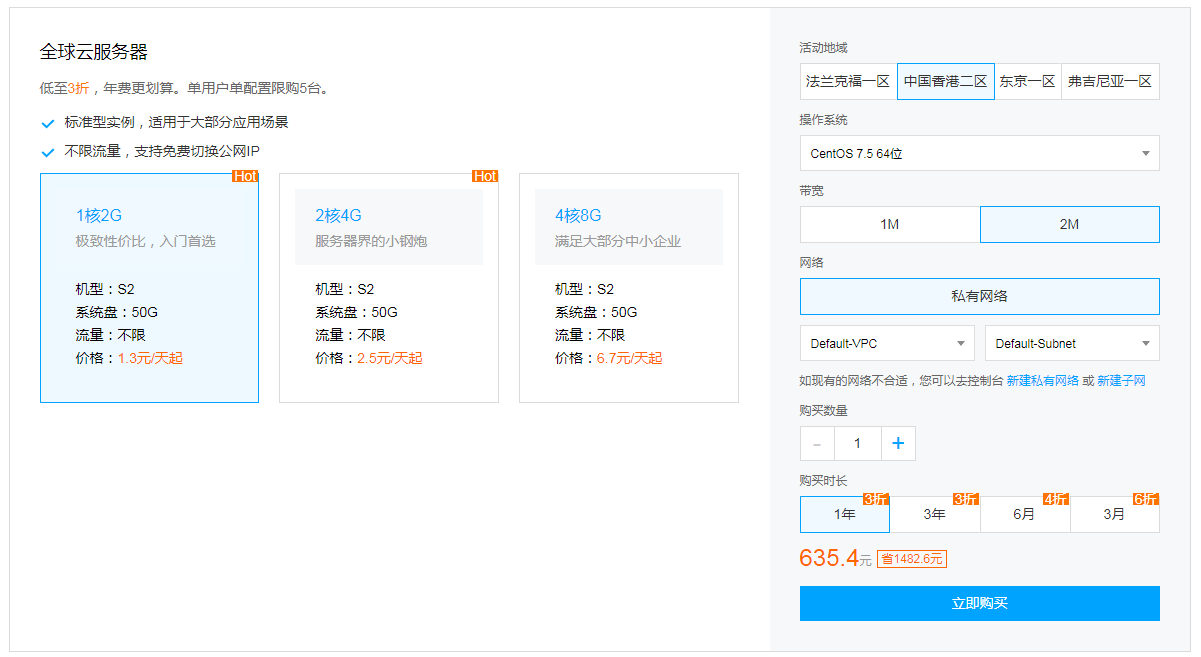 下面列举的所有云服务器方案新老用户均可以购买,并且单配置最多可以购买五台,最长时限可以购入三年,三年的时长无需担心续费价格贵的问题,单配置五台能满足多业务的需求。 下面主要是三折促销的海外云服务器,有香港、日本节点可以选择。1核2G、2核4G、4核8G黄金配置,1年、3年均为三折优惠。