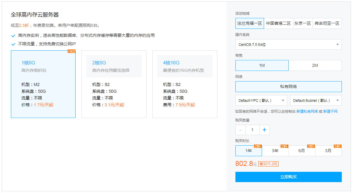 下面是高内存海外云服务器方案,最低到2折起,2核8G内存是非常不错,5Mbps带宽1210.8元/年、3632.4元/3年。