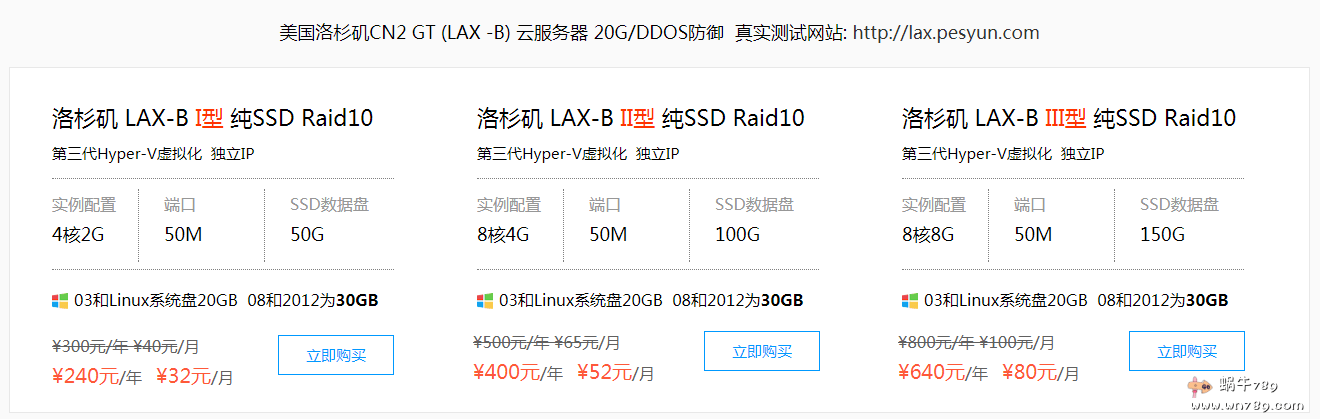 | 洛杉矶 LAX-B I型 | 4核 | 2G | 80G Raid10 | 50M独享 | Hyper-V | 1个 | 240元/年 480元/3年 | 点击直达 |
