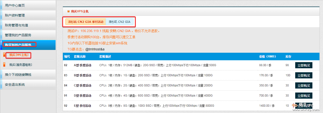 TmhHost购买教程如下:点击本博客直达链接到官网注册一个账号并登陆用户中心,然后如下图选购。