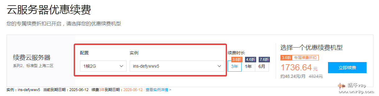 腾讯云"共克时艰 续费扶持"是针对现有老用户的续费扶持活动,腾讯云服务器续费扶持活动仅向特定老用户开放。可参与续费活动的腾讯云云服务器配置:1核1G内存、1核2G内存、1核4G内存、2核2G内存、2核4G内存、2核8G内存、4核4G内存、4核8G内存。可参与活动机型:S2、S3、SN3ne、S4、S5、SA1。可参与活动带宽:带宽超过10M不参与!不支持广州1区、上海1区、北京1区、海外区参与(中国香港除外)。每个符合活动条件的用户只能为账户内的一台云服务器实例续费一次,请谨慎选择优惠续费时长。 自己适不适合参与活动,在活动页面登陆自己的账号即可查看到了。 如下图蜗牛是可以参与的,蜗牛手上有一款腾讯云1核2G内存的配置,2Mbps带宽,选择一次性续费3年的话可以享受3.6折的优惠,仅需要1736.64元/3年!!!大家选择这个续费周期一定考虑清楚了,每个用户只能为一台云服务器续费一次,所以年限根据自己需要选择,个人建议一般是一次性三年!!! 目前有腾讯云服务器快到期的小伙伴们不要错过啦!另外再划一个重点,如果你现在没有正在使用的腾讯云服务器也没关系,前往腾讯云助力行业复工,100%CPU性能云服务器4核8G5M1684元/3年,新老用户均有车活动中选购一台同样也可以成为老用户,同样可以在活动期间内享受续费扶持!