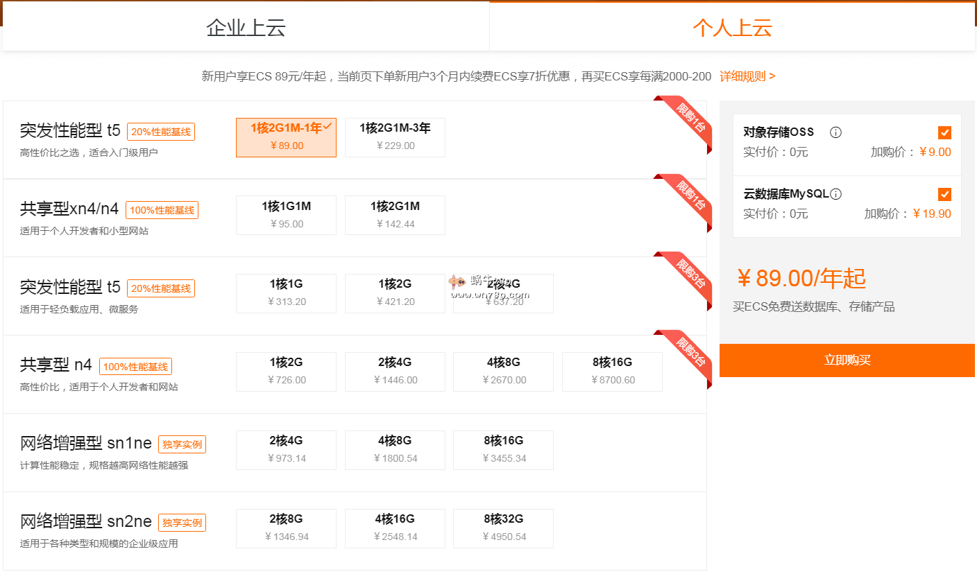 阿里云上云必备活动相比之前在方案介绍形式上还是值得肯定的,毕竟比较直观了,不像以前的促销活动,看着头疼。阿里云适合企业使用的云服务器需要企业认证新用户参与。大家可以根据自己业务需要重点关注1折、0.7折、0.8折的促销方案。同时购买云服务器还可以以超低价格加购“对象存储、云数据库”等。蜗牛比较建议的便宜云服务器是“共享通用型 mn4 2核8G”5M带宽配备,3年给0.7折优惠、1140元就能拥有2核8G5M带宽的云服务器三年。 另外还画一个重点:下面促销的云服务器方案新用户续费享7折优惠。 没有企业认证用户,如有与办法撸阿里云新账户,那么还有这个活动可以参与:阿里云服务器2020年2月促销,100%CPU性能,2核4G3M469元/2年。