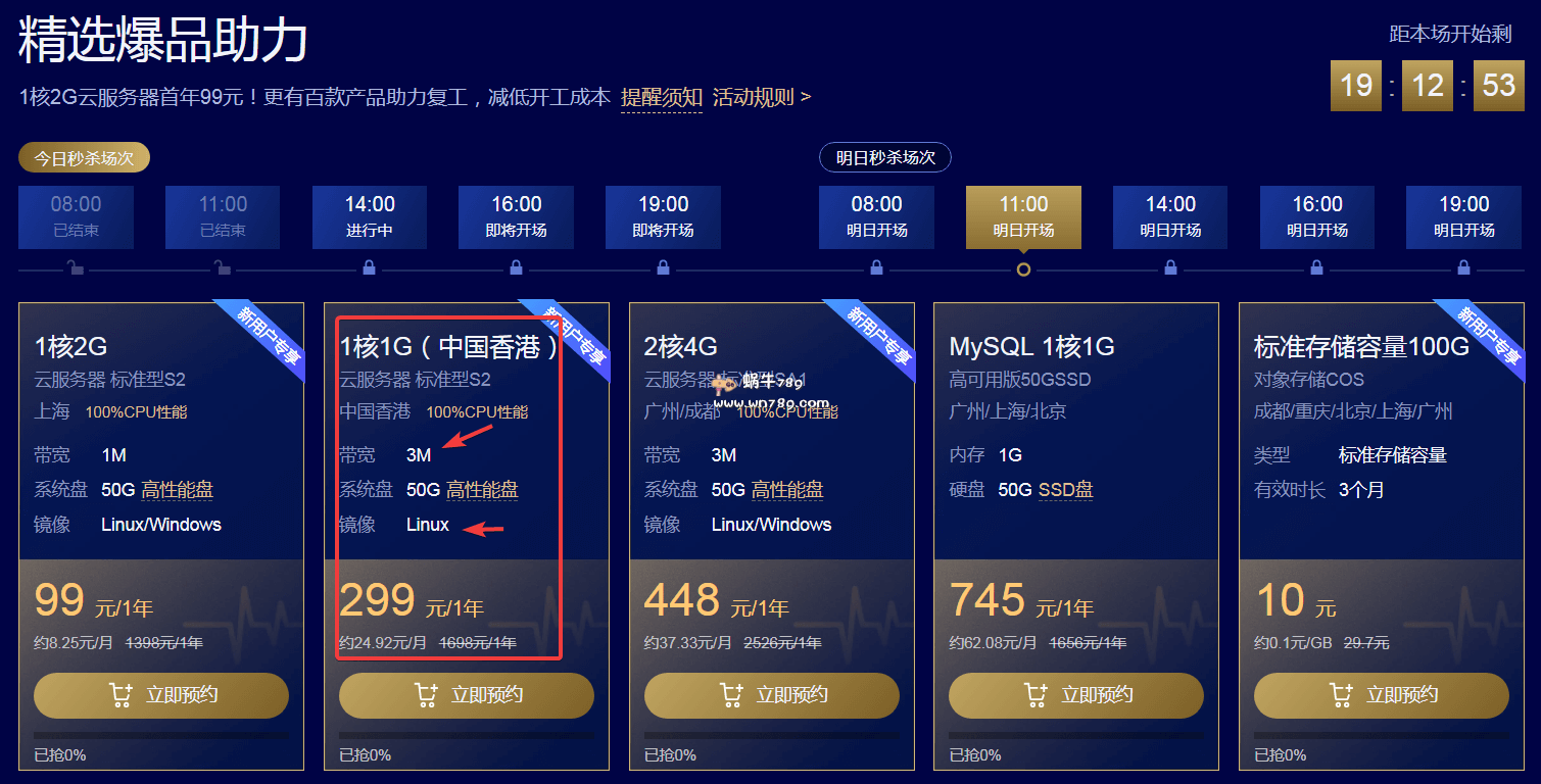 如下图,如果我们有要选择香港云服务器,那么一定注意下,1核1G内存Linux系统299元/年的方案给的是3Mbps带宽,另外249元/年的香港云服务器给力的是1Mbps带宽。这个地方很容易被忽略了!怕错过秒杀时间的请点击“立即预约”即可设置秒杀提醒,腾讯云会通过短信提示你预约的云服务器开启秒杀!