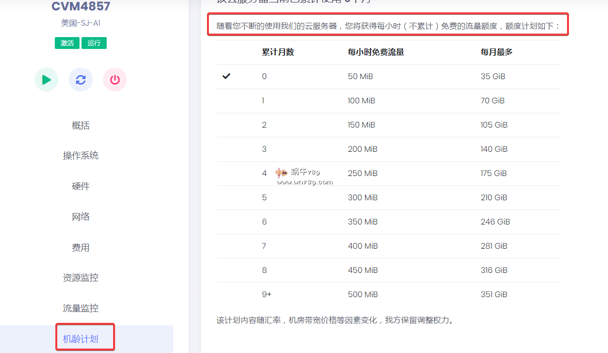 DogYun按小时计费云服务器是按流量使用量计费的,在一定程度上能更好的节约成本,特别是对流量需要不大的用户和建站用户。当然流量大的用户也可以购买流量包来使用,更为划算! 除此之外DogYun还有一个非常人性化的机龄计划,DogYun机龄计划详细介绍:DogYun机龄计划就是根据云服务器的使用时长按小时免费赠送流量!!下面是DogYun美国圣何塞云服务器的机龄计划赠送流量详细情况,其他的DogYun云服务器产品也可以通过下图位置查看。
