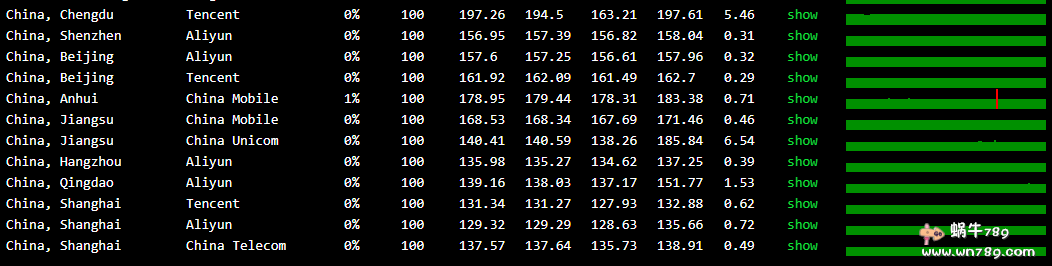 1、异株湖CloudService便宜美国安畅CN2 GIA VPS国内三网ping测试结果。127个测试节点平均158.1 毫秒!三网速度都优异。