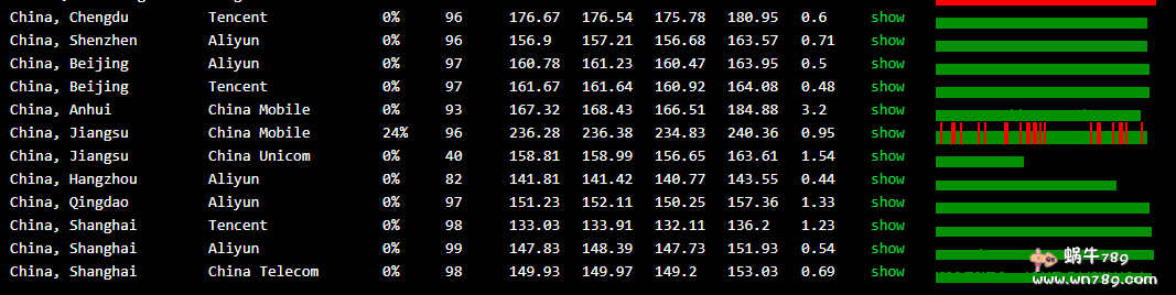 2、桔子VPS洛杉矶CN2 VPS国内三网丢包及抖动测试。ping延迟低、丢包的话也不行,看看下面的丢包及抖动测试。从测试结果来看除了个别移动节点有丢包外,其他测试节点都没有丢包,而且速度也非常稳定。