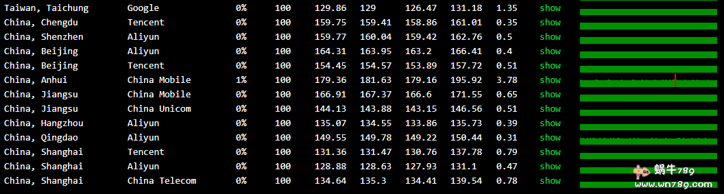 2、VPSMS新品美国CN2 GIA VPS国内三网丢包及抖动测试。可以看到测试节点是非常平稳的,丢包的只有一个移动节点有一次。