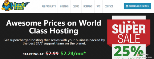 HawkHost(老鹰主机)成立于2002年的老牌美国商家,多年来一直专业从事建站主机销售,因为很早就开始支持支付宝付款,其虚拟主机在国内是有一定的用户群体的,一直有较好的口碑,适合用于外贸站等,是低价格便宜国外虚拟主机!HawkHost针对虚拟主机产品长期有最高6折的促销活动: