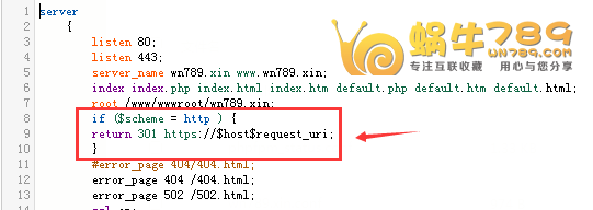 下面代码中的域名请注意修改成自己的域名,切勿完全照搬。另外还要注意的是删除原来代码中的“listen 80;”。