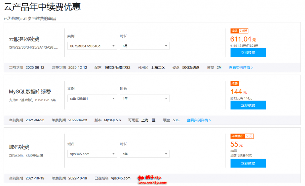 登录后有续费产品是这样的。云服务器一次性续费三年可以享受3折。