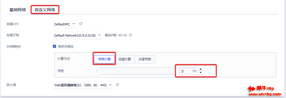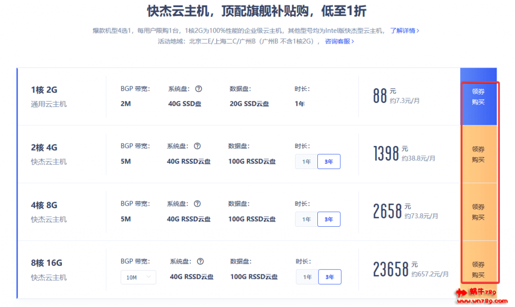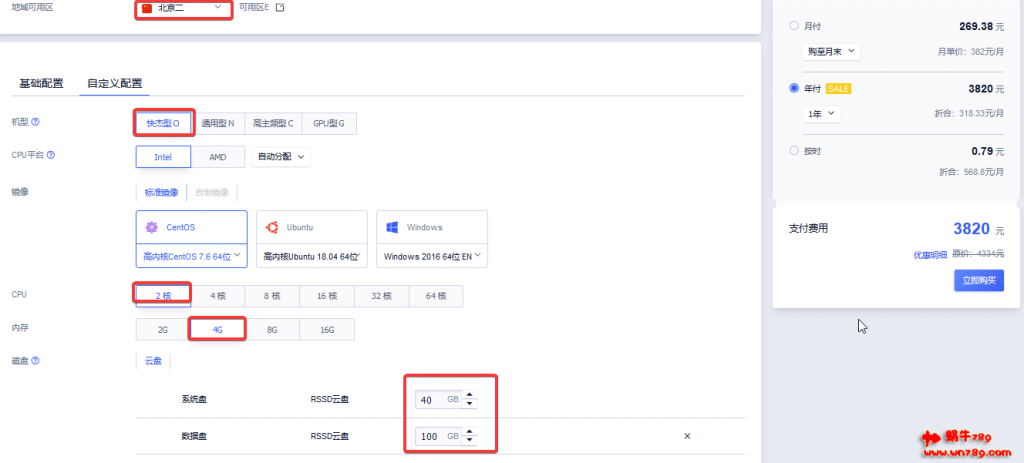 3、注意选购配置要与我们领取的促销配置一致。以蜗牛将要购买的快杰云服务器2核4G内存促销方案为例。首先我们找到数据中心,有快杰云服务器可以选的数据中心!北京、上海、广州有快杰云主机可以选择。上海还要选择“可用A区”!数据中心后面的可用区是可以更换的哦,其次就是对应的配置了,一定要选择“自定义配置”,CPU、内存、系统盘、数据盘、还有带宽均要选择与促销配置完全一致的!另外购买时间也一定要选对,蜗牛在下图右侧没有标注出来,蜗牛选择的是1年付款周期,所以勾选了年付、周期是1年!