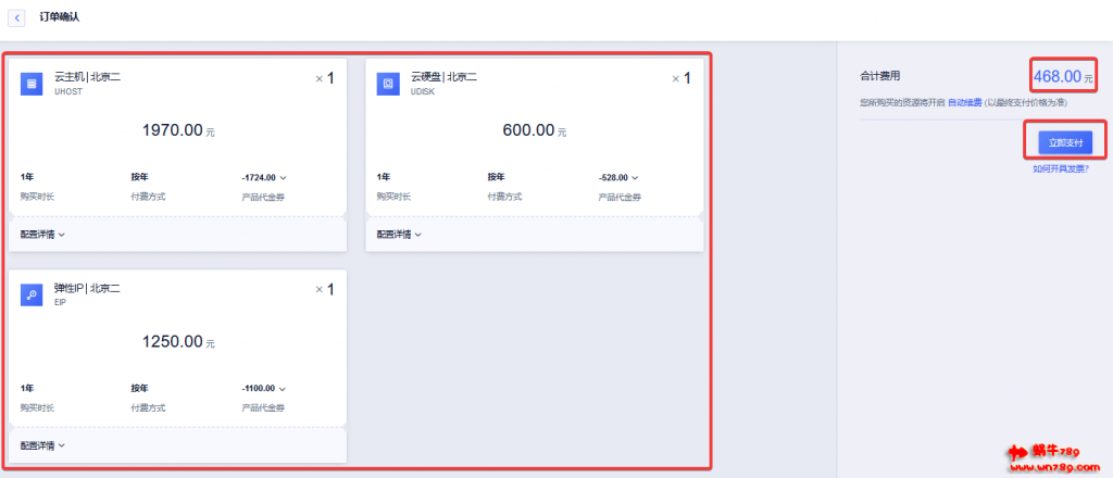 4、配置选择好了之后设置root密码就可以点击立即购买到“订单确认”页面了。这里我们就可以看到之前领取的优惠券都自动使用上了。接下来付钱就开通了。