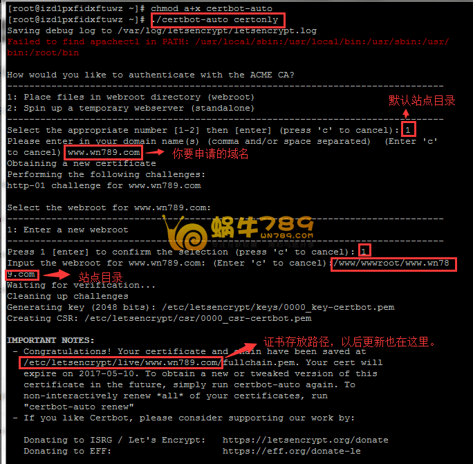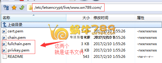 4、申请的证书存放路径为“/etc/letsencrypt/live/www.wn789.com/”。另外需要注意的是Let's Encrypt 免费SSL证书只有90的有效期,需要自己更新。如果以后执行自动更新也是在这里。