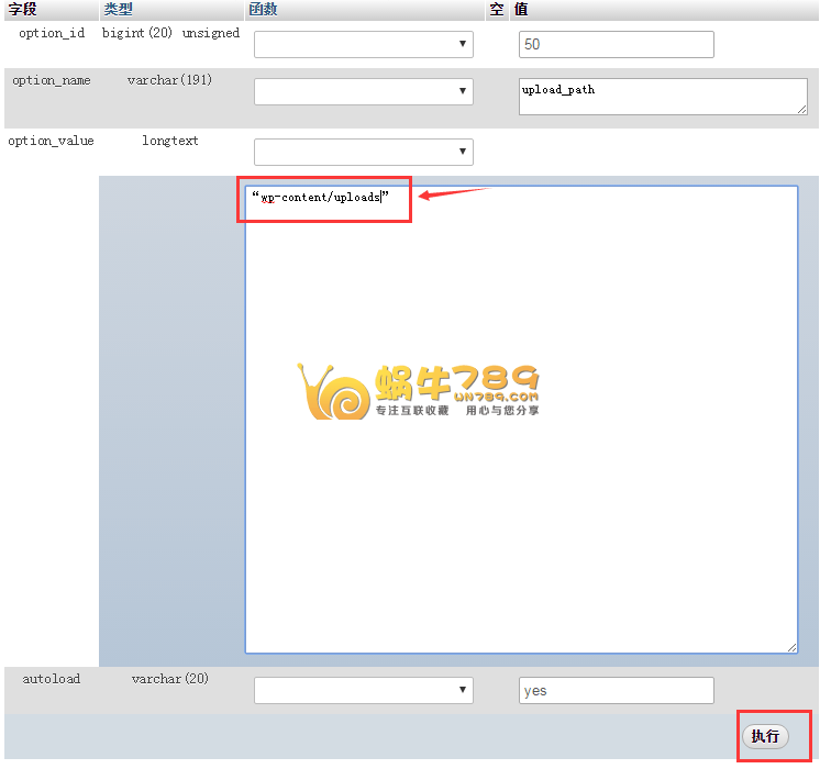 3、添加“wp-content/uploads”,记得要把引号也复制进去。点击“执行”更改完成修改。、
