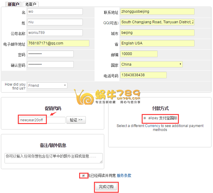 2、填写注册信息。如果有优惠码也在这个页面使用,填写验证码后,记得点击“验证”。最后点击“完成订购”进入到支付宝付款页面完成付款即可购买成功。