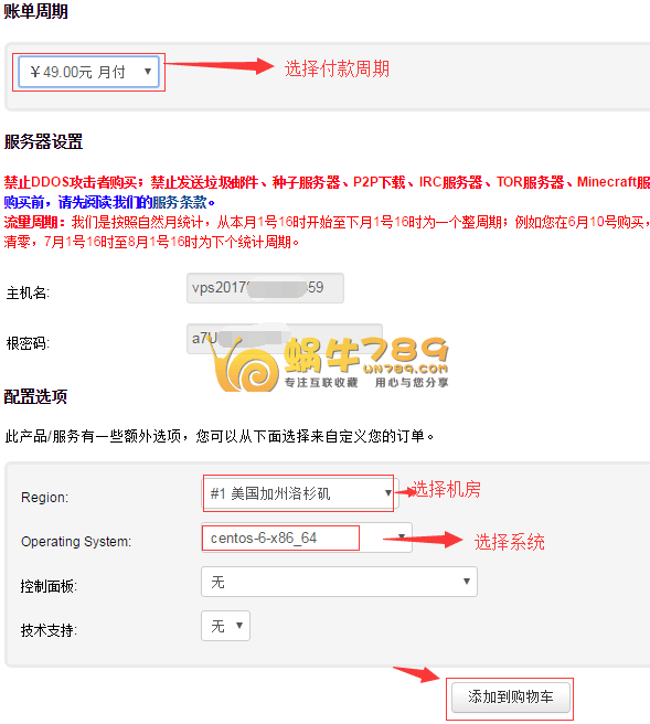 1、在上面选择需要购买的VPS点击"点击购买"进入到IdcBuster购买页面。然后选择付款周期、机房位置、操作系统版本。