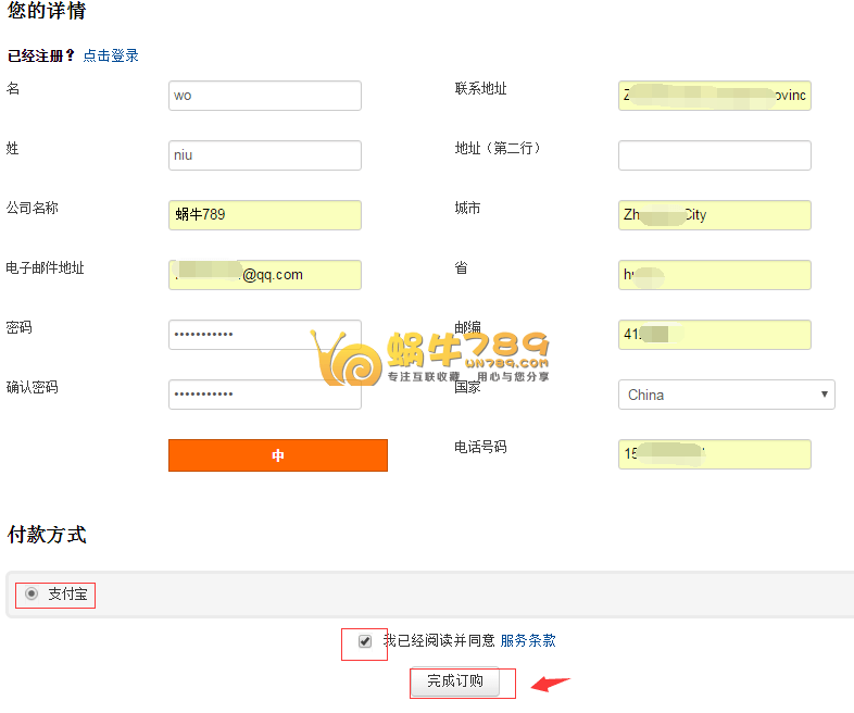 3、填写注册信息,使用支付宝付款,即可购买成功。